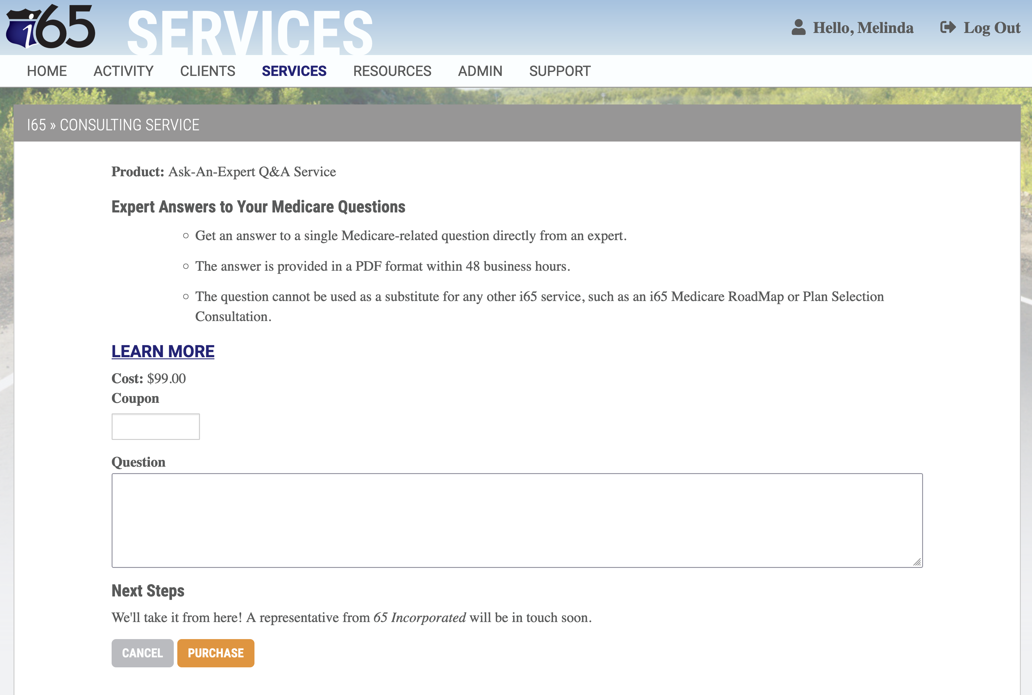 Within 2-3 business day, you'll receive a written response from a Medicare expert at 65 Incorporated that you can then share with your client.