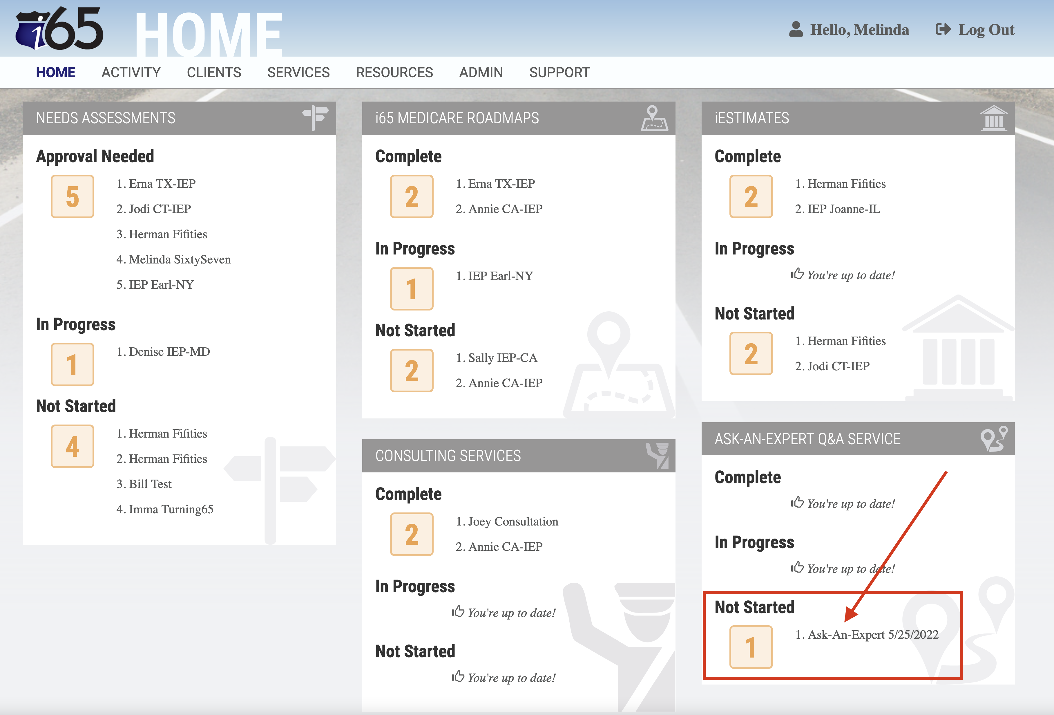 Head to the dashboard (Home) in i65. Look for the Ask-an-Expert service panel on this page.